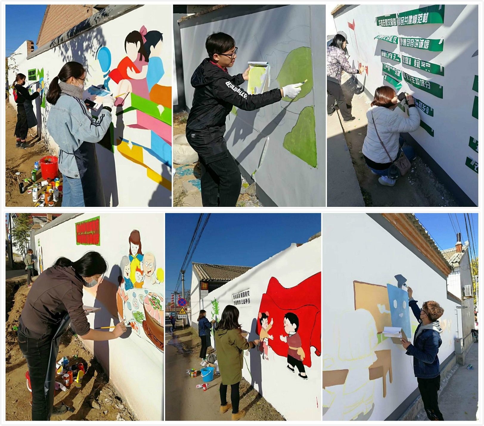 参加的学生党员和入党积极分子分成八组,分别来到井庄镇的井家庄村、西红山村等八个村庄进行主题墙绘。眼见着原本光秃秃的墙渐渐地焕发了生机,吸引了不少村民驻足观望和一起帮忙。经过一天的努力,共完成了千米长的108幅墙绘作品,图文并茂、栩栩如生,充分展现了延庆的历史的文化底蕴和“村规民约”丰富精神内涵,发挥了文化墙传播文明,传递正能量的宣传阵地作用,成为一道靓丽的风景线。
