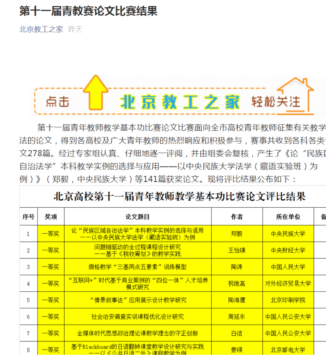 据悉,北京高校青年教师教学基本功比赛是由中共北京市委教育工委、北京市教委、中国教育工会北京市委员会和教育部全国高校教师网络中心主办,是面向所有在京高校的省部级教学技能比赛项目,每2年举办一次,分为教学基本功和教学论文比赛两大板块。其中,论文比赛旨在进一步鼓励青年教师进行教学研究,促进教育教学发展,搭建一线教师与教学专家的交流平台。此番获奖,是对我院教育教学工作的充分肯定,也是对学院青年教师积极投入教学研究的极大鼓励。