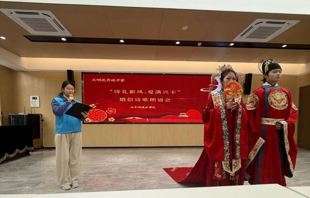 志愿者们在会场担任传统华服“代言人”,身着精美的明制婚服,化身传统婚俗的主角,展示传统服饰之美;志愿者们在会场担任朗诵会的“主持人”,以沉稳的台风和流畅的衔接串联整场活动,让观众沉浸在诗歌的韵律和婚俗的文化内涵当中;志愿者们在会场担任文明新风的“讲述者”,在婚俗采访环节,用生动自然的表达分享当代年轻人对文明婚俗新理念的理解。