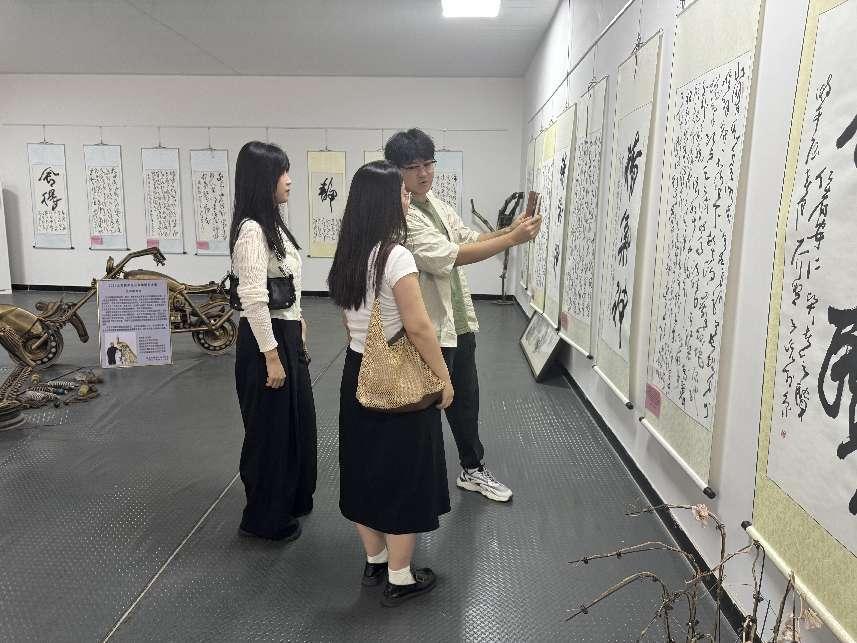 在鲍家铺村党支部书记鲍海涛的引导下,一行人先前往鲍家铺村艺术展览馆围绕展览布局、作品陈列等细节问题,与鲍海涛书记进行了详尽的交流,并就更好地将艺术教育与思政教育相融合、用艺术与科技助力乡村振兴进行了深入探讨。