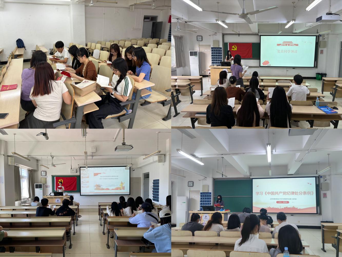 学院定期给学生党支部推送中央纪委国家监委微信公众号上的关于党纪学习教育的微视频和“图解纪律处分条例”相关推送,支部党员进行自学。各支部每周开展一次《中国共产党纪律处分条例》的集中学习和研讨,原原本本学习《条例》内容,坚持逐章逐条学、联系实际学,进一步明确日常言行的衡量标尺,用党规党纪校正思想和行动。