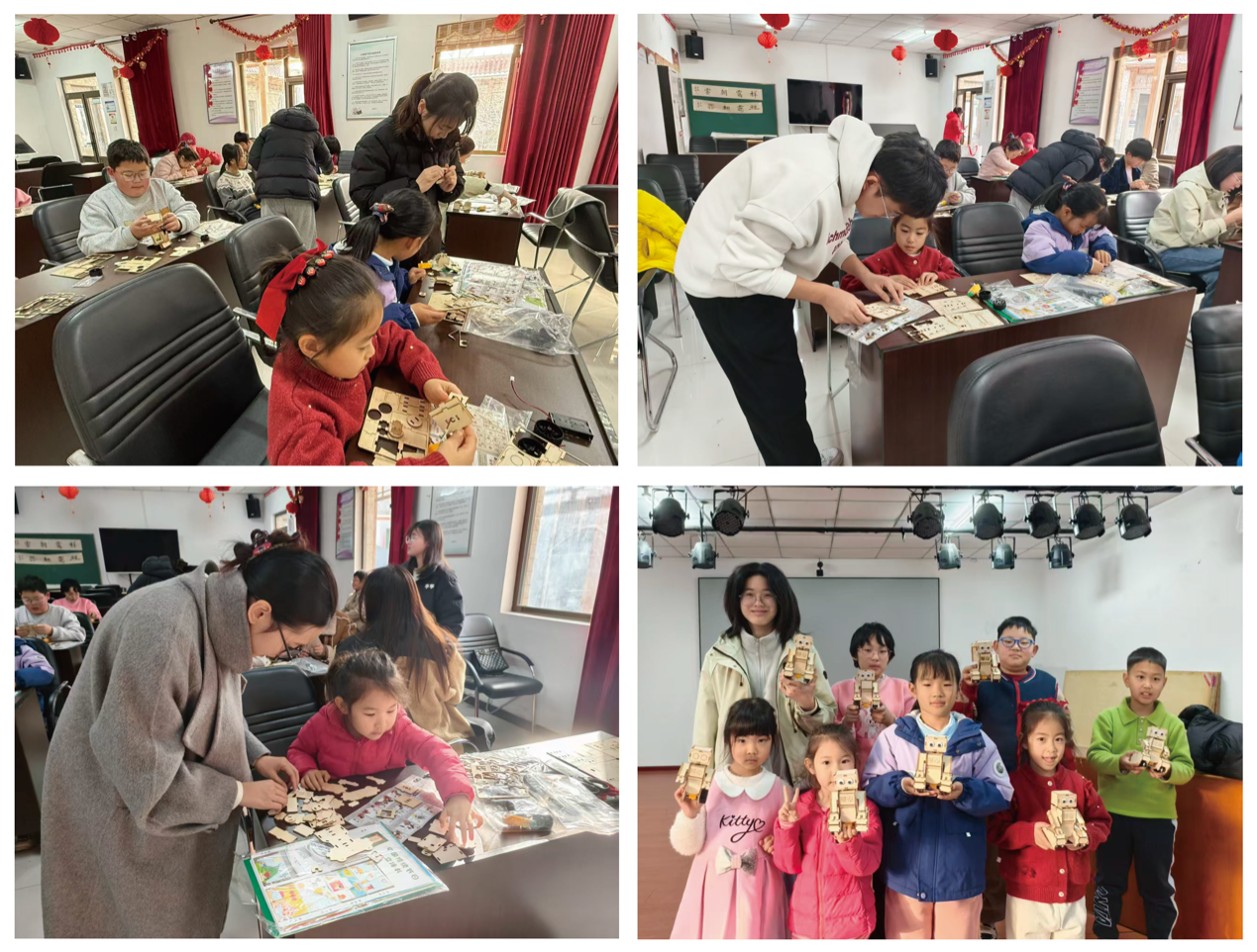 “传统节日立体书”手工制作则注重传统文化与手工结合。孩子们在了解春节、中秋等传统节日的由来与习俗后,动手制作立体场景页。通过剪裁、折叠、粘贴等步骤,平面的纸艺元素逐渐变为可互动的立体画面。有的孩子还在书中加入自己绘制的节日元素,展现出丰富的想象力。过程中,党员学生分组指导,孩子们也互帮互助,不仅锻炼了动手能力,也加深了对传统文化的理解。