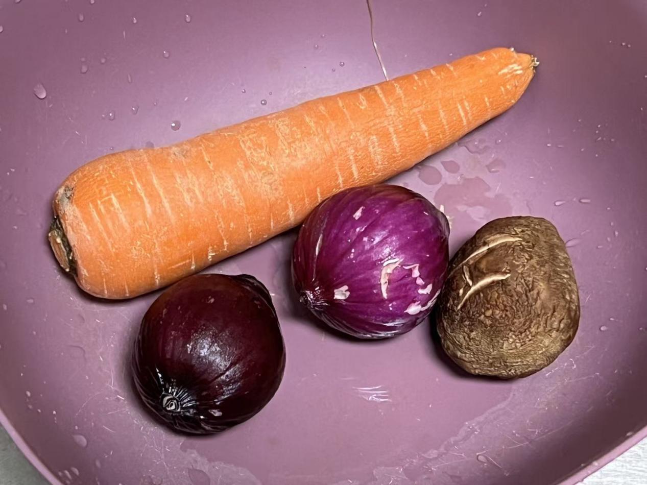 2. 准备胡萝卜、洋葱、香菇等蔬菜