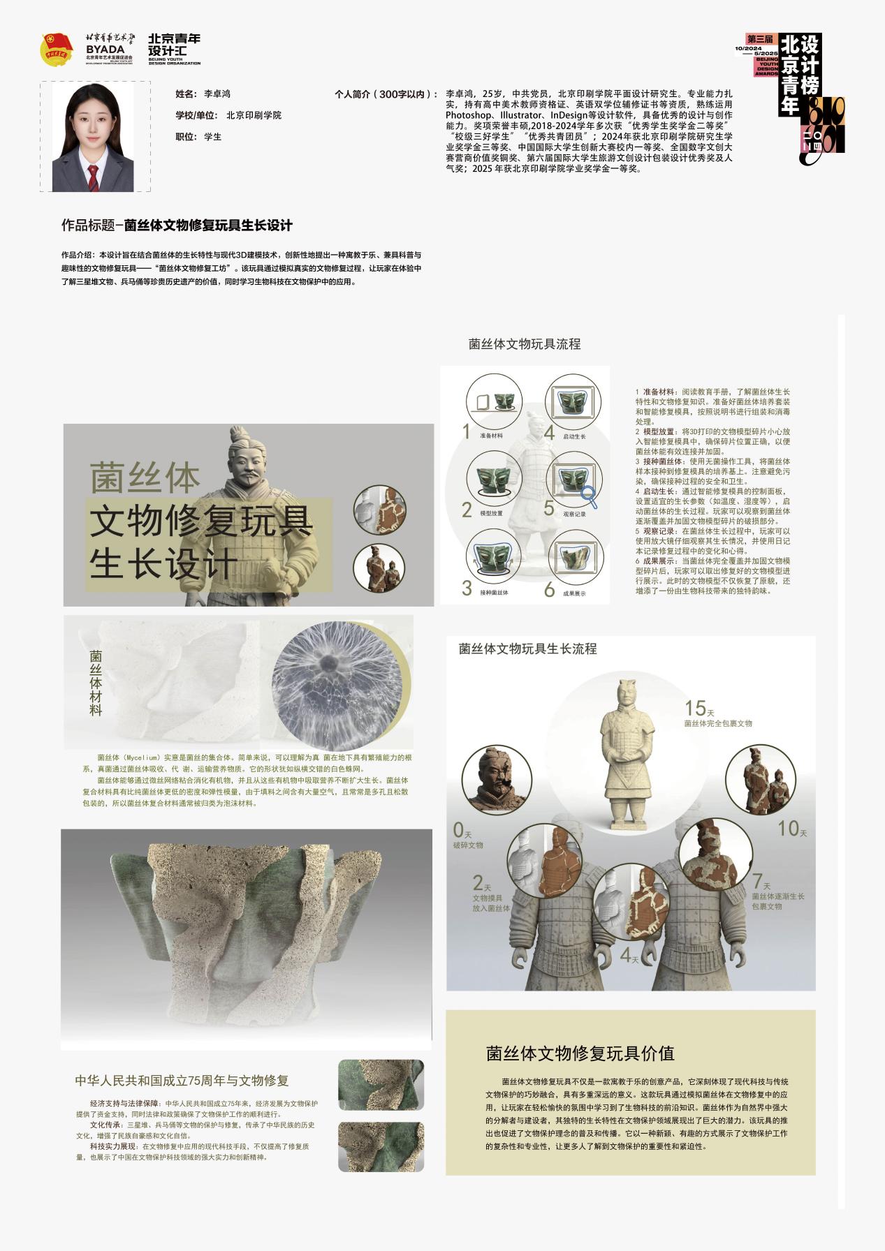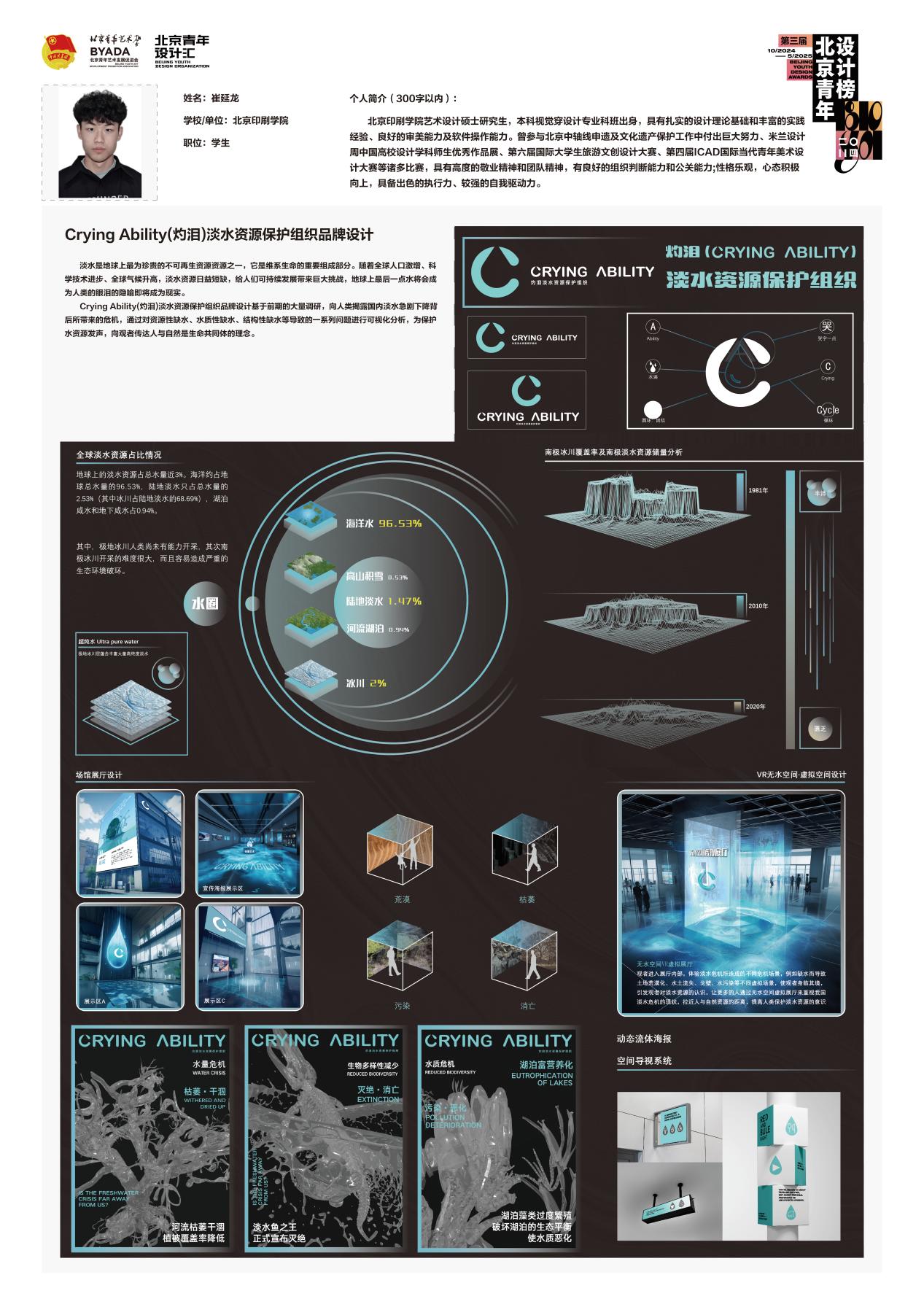 在本次活动中,学校学生凭借扎实的专业功底、鲜明的设计特色和深刻的社会洞察力,在视觉传达设计、包装设计、书籍设计、数字媒体艺术、文创产品设计等多个赛道中表现出色。2025级研究生李昊桦同学的作品《平江九巷品牌形象设计》,以平江路历史文化为根基,用现代设计语言构建“平江九巷”特色品牌视觉体系,赋能文旅体验升级。2025级研究生李子雯同学的作品《菌丝体材料国际象棋益智玩具创新设计》,是一款结合国际象棋与拼图功能的双重益智亲子教育类产品,以环保为主题,探索菌丝体材料在亲子互动益智玩具中的应用。2019级研究生崔延龙同学的作品《Crying Ability(灼泪)淡水资源保护组织品牌设计》,以“淡水危机”为核心线索,通过“Crying Ability(灼泪)”这一极具张力的品牌概念,将淡水资源枯竭的抽象危机转化为可感知的视觉叙事。2023级本科生于嘉悦同学的作品《涟漪时光》以“时钟”为视觉核心,通过澄澈通透、细腻洁净的形态,将水的纯净本质与时间的流逝意象相融合,寓意水资源与生命进程的一体性。2025级研究生刘忠博同学的作品《基于山东鲁锦体感交互设计》,以“鲁锦技艺活化”为核心,通过体感交互技术(手势识别、动作追踪、多人互动)实现非物质文化遗产与现代数字媒介的跨时空对话。