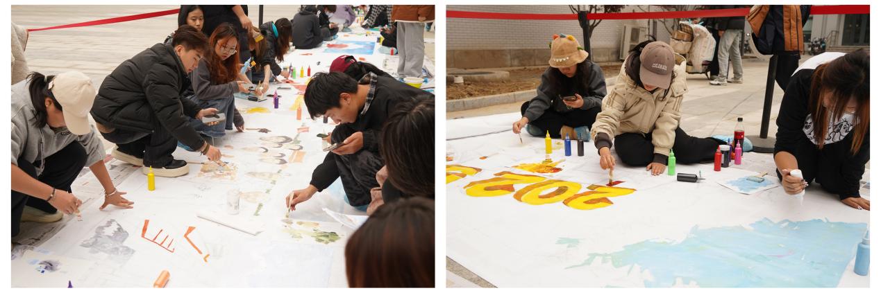 本次大赛围绕抗战历史及抗战精神、纪念中国人民抗日战争暨世界反法西斯战争胜利80周年大会、北印校园文化等主题创作。大赛以学生组织、新生宿舍为单位绘制手稿,经专业教师三次审稿,不断打磨修改,最终在校园进行集体创作。