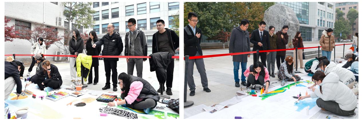 为深入学习贯彻党的二十届四中全会精神和习近平总书记在纪念中国人民抗日战争暨世界反法西斯战争胜利80周年大会上的重要讲话精神,传承弘扬伟大抗战精神,扎实开展“三观三感”教育,10月29日,设计艺术学院举办“铸‘三观’传承抗战精神 强‘三感’挺膺青春担当”第22届百米长卷主题绘画大赛。学校党委书记张鑫到学生比赛创作现场与学生亲切交流。